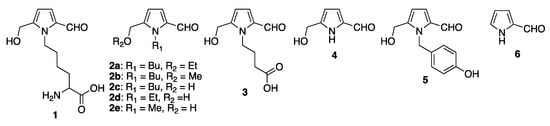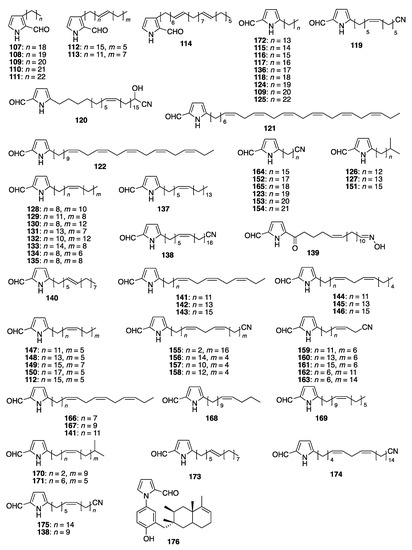Chicago/Turabian StyleMatsugo, Seiichi, and Yutaka Nakamura. 2023. "Pyrrole-2-carboxaldehydes: Origins and Physiological Activities" Molecules 28, no. 6: 2599. https://doi.org/10.3390/molecules28062599