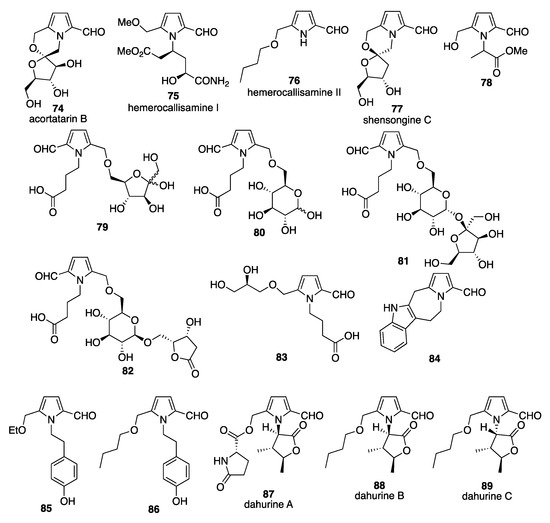 From the fruit of Capparis pinosa, two new Py-2-C derivatives—capparisine A (18) and capparisine B (58)—were isolated, along with the known Py-2-C derivatives 2-(5-hydroxymethyl-2-formyl-1-yl) α-methyl-acetic acid lactone (37) and N-(3′-maleimidyl)-5-hydroxymethyl-2-pyrrole formaldehyde] (47) [49]. From bee-collected Brassica campestris pollen, pollenpyrrosides A (17) and B (18) were isolated, and the precise structures were determined using several spectroscopic analysis techniques (NMR, UV, IR, MS, and X-ray) and chemical evidence [63]. Pollenpyrroside A and caparisine B are diastereomers of the same spiroketal alkaloid. The total synthesis of these compounds has been reported, which started with d-fructose as a chiral substrate followed by microwave-assisted bishydroxymethylation of the pyrrole ring and a key acid-catalyzed cyclization [64]. Another approach used a Maillard-type condensation of an amine derived from deoxy-d-ribose. After several steps, pollenpyrroside A (17) was synthesized and the exact stereochemistry of 17 was confirmed [65]. Similar spiroketal pyrrole alkaloids, acrotartarins A and B, were also isolated from Acorus tartainowii. The structures (absolute configurations) of acrotartarins A and B were determined using various spectroscopic analyses and X-ray diffraction analysis [66]. After the isolation of acortatarins A (18) and B (74), total synthesis has been attempted by several groups, and the absolute configurations of acortatarins A and B were determined [67,68,69,70,71]. From the flower buds of the daylily, the glutamine derivatives hemerocallisamine I (75) and hemerocallisamine II (76) possessing Py-2-C moieties have been isolated and characterized based on the spectral evidence (UV, MS, HRMS, and 1H- and 13C-NMR) and X-ray analyses [72,73]. The total synthesis of hemerocallisamine I using a Maillard-type condensation of a cis-4-hydroxy-l-proline derivative with a dihydroxypyranone is a key step, which afforded the 2-formylpyrrole ring system. Subsequent removal of the protecting group gave hemerohallisaline I and the optical rotation data indicated the stereochemistry of hemerohallisaline I (revised as 2S,4S-hemerocallisamine I) [74]. From the traditional Chinese medicine (TCM) anti-arrhythmic formula Shensong Yangxin capsule, four Py-2-Cs (shensongines A (19), B (20), and C (77), and pollenpyrroside B (18)) bearing a morpholino chromophore (spiroalkaloids) have been isolated and characterized based on the spectroscopic data (1H- and 13C-NMR and HMBC) [75]. The configurations of these compounds were determined by comparison with the known literature values for the optical rotation and the 1H-NMR spectra, including 1H-1H COSY and HMBC. Some of these compounds were already known: shensongine A is xylapyrroside A (ent-(enantiomer)-capparisine B), shensongine B is xylapyrroside B, and pollenpyrroside B has the same structure as ascrotatarin A (ent-(enantiomer) capparisin A). The new Py-2-C, methyl 2-[2-formyl-5-(hydroxymethyl)-1H-pyrrol-1-yl]propanoate (78), was isolated from a Goji berry-contaminated commercial sample of African mango, along with three other known Py-2-Cs (22, 4, and 37) [76]. From an ethanol extract of the roots of Ranunculus ternatus Thunb (20 kg) four Py-2-Cs (79, 80, 81, and 82; 15, 12, 10, and 8 mg, respectively) were isolated that bear monosaccharides or disaccharides at the hydroxymethyl group on the pyrrole ring. The structures of these compounds (named ranunculins A–D) were elucidated by spectroscopic analyses and the calculated ECD values [77]. These molecules interestingly have a tail-to-tail bond (6,6 ether linkage). This is a previously unreported hybrid of a γ-amino acid and a sugar. New heterocyclic compounds have also been isolated and characterized from Ranunculus ternatus Thunb., including the furfural derivative 4-{2-[(2S-2,3-dihydroxypropoxy)methyl]-5-formyl-1H-pyrrol-1-yl}butanoic acid (83) [78].