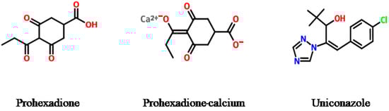 Chemical structure of plant growth regulators (prohexadione, prohexadione-Ca, and uniconazole).