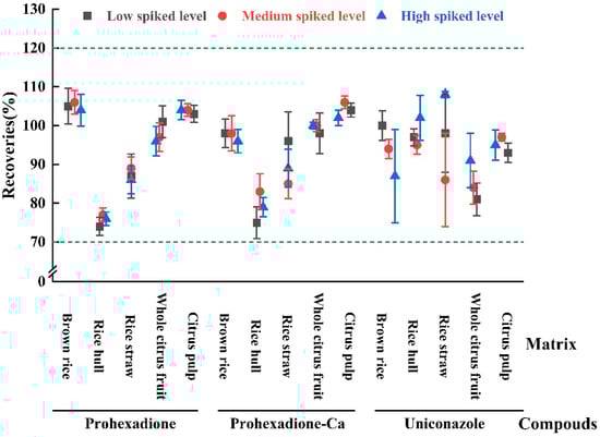 The trueness (accuracy), sensitivity, and precision of the developed analytical method were validated, and the important parameters of the matrix-based standard curves are summarized in Table 1. The calibration curves used to quantify the citrus tests exhibited excellent linearity over the studied range. The prohexadione curve ranged from 2 to 200 ng/mL, while the uniconazole curve ranged from 0.5 to 100 ng/mL, and both displayed correlation coefficients exceeding 0.999 0. The fortified recovery study was performed to evaluate the accuracy and precision of the developed method in quantifying prohexadione, prohexadione-Ca, and uniconazole residues in citrus and rice samples. The study involved adding known amounts of the target analytes to blank citrus and rice substrates at three different concentrations. For prohexadione and prohexadione-Ca, the concentrations were 0.05, 0.50, and 0.50 mg/kg in rice, and 0.05, 0.50, and 1.00 mg/kg in citrus. For uniconazole, the concentrations were 0.01, 0.50, and 1.00 mg/kg and 0.01, 0.50, and 1.00 mg/kg in citrus. The recovery tests for both citrus and rice were carried out in 5 parallel for each concentration. The recovery results are presented in Figure 2, where the error bar represents the coefficient of variation. The developed method showed good accuracy with average recoveries ranging from 74% to 106% for prohexadione, 75% to 106% for prohexadione-Ca, and 81% to 108% for uniconazole, with coefficients of variation ranging from 0.8% to 12% in five different substrates of rice and citrus. The limit of quantification (LOQ) for prohexadione and uniconazole in brown rice, rice hull, rice straw, whole citrus fruit, and citrus pulp was determined to be 0.01 mg/kg and 0.05 mg/kg, respectively. The sensitivity, trueness, and precision results met the requirements of analysis according to the NY/T 788-2018 guidelines [41].