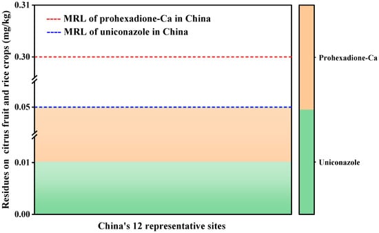 The maximum residue limits (MRLs) for prohexadione-Ca and uniconazole in rice and citrus were currently established by China, Japan, the United States, and European Union countries. For brown rice (rice and its products), the MRL for prohexadione-Ca was 0.05 in China and 0.2 in Japan, while the MRL for uniconazole was 0.1 in both countries. In citrus fruits, the MRL for prohexadione-Ca was 0.01 in the EU and 3.0 in the US, while that for uniconazole was 0.01 in the US and 0.3 in China. The residue analysis of prohexadione-Ca and uniconazole in rice and citrus showed that the residual value of prohexadione-Ca in citrus may exceed or be below the EU MRL because they were found to be below the LOQ established in this study. Therefore, as the field experiment was conducted in 12 representative locations in China, the study carried out further analysis using the lowest MRL established in China. As shown in Figure 3, after spraying prohexadione-Ca and uniconazole on rice and citrus at these locations, the residue levels were much lower than those of the MRLs established in China. Since PGRs are typically used during the growth period of rice and citrus, they were considered to be safer than other pesticides at the edible maturity stage.