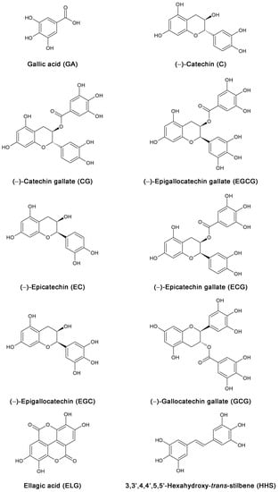 We therefore investigated the effects of the main green tea catechins, namely catechin (C), catechin gallate (CG), EGCG, epicatechin (EC), epicatechin gallate (ECG), epigallocatechin gallate (EGC), and gallocatechin gallate (GCG) regarding their ability to inhibit or lower virus replication in vitro compared to the potent and clinically used anti-COVID-19 drug remdesivir. As Maiti and Banerjee [3] showed that the number of galloyl groups favors greater attachment to the receptor ACE2, we also included gallic acid (GA) and ellagic acid (ELG), a dimeric gallic acid derivative, in our study—both compounds also present in considerable amounts in green tea. Previous investigations in our lab demonstrated that the anticancer and anti-inflammatory effects of resveratrol analogues are increased by the number of OH groups [6,7,8]. In order to investigate whether the numbers and position of phenolic groups of green tea compounds may also correlate with activity, we included 3,3′,4,4′,5,5′-hexahydroxy-trans-stilbene (HHS), a synthetic resveratrol analogue. The chemical structures of all compounds used are shown in Figure 1.