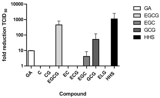 Calculating the median tissue culture infective dose of TCID50, four out of nine green tea compounds were active (Figure 2). The structure–activity relationships revealed that EGCG, EGC and GCG contain a pyrogallol group in their chemical structure (pyrogallol: benzene 1,2,3, triol is a decarboxylation product of gallic acid). Compounds with only one galloyl group (CG and ECG), however, showed no virus inhibition. Interestingly, GA was slightly active, possibly because of the additional carboxyl group. One galloyl and one pyrogallol group further increased the potency (13-110-fold reduction), as shown for GCG and ECGC. HHS, a synthetic resveratrol analog containing two pyrogallol groups, showed the highest fold reduction of viral replication (1103-fold), indicating that pyrogallol groups are more important for activity than galloyl groups. Our data are in contrast to Maiti and coworker [3], who did not discriminate between the galloyl and pyrogallol groups and, therefore, wrongly stated that the numbers of galloyl groups of catechins favor binding in the central channel of the spike protein. However, we are well aware that in addition to galloyl and pyrogallol groups, other structural features of green tea constituents, e.g., lipophilicity, molecular weight, and binding affinities to SARS-CoV-2 proteins, may also contribute to the activity.