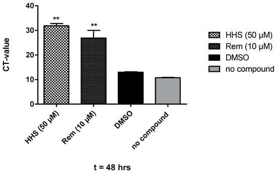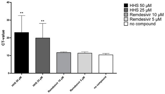 Treatment of Vero E6 cells with HHS (50 µM), remdesivir (10 µM) and DMSO (1% in medium). Compounds were present pre- and during infection with SARS-CoV-2 and during incubation. After 48 h, RNA was extracted, and the viral copy numbers were quantified via qRT-PCR. Values represent the CT values (means ± SD) of five determinations. Asterisks (**) indicate significantly different (p < 0.01) in comparison to no compound (non-parametric unpaired t-test).