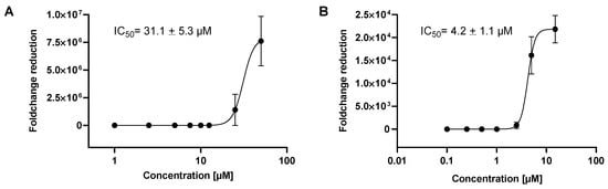 Effect of treatment of Vero cells with the respective substances compound (50 µM) after infection of the cells with SARS-CoV-2. Vero cells were preincubated for 45 min with either DMSO or the compound and infected with a SARS-CoV-2 stock. After five to seven days TCID50 dose was calculated. Values represent the average + half range of two determinations.