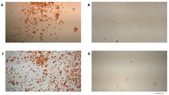 SARS-CoV-2 specific immunohistochemical staining (IHC) of VeroE6 cells treated with different concentrations of HHS and remdesivir as described in the methods part (images were made from IC50 experiments). Virus-infected cells appeared red. The microscopy images are shown in four-fold magnification. (A,B) HHS 7.5 µM and 50 µM; (C,D) remdesivir 0.25 µM and 10 µM.