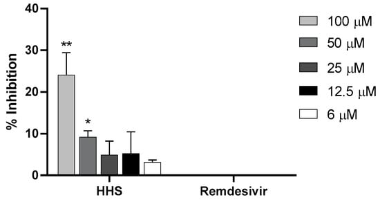 Percentages of inhibition of RBD-ACE2 binding (y-axes) after pre-incubation for 3 h at RT with various concentrations of HHS and remdesivir (x-axes) followed by a 3 h overlay onto plate-bound ACE2. Bound RBD was detected with a mouse monoclonal anti-His antibody followed by a HRP-labelled anti-mouse IgG1 antibody and detected with ABTS. Values represent the means ± SD of three determinations. Asterisks (*, **) indicate significantly different (p < 0.5 and p < 0.01, respectively) in comparison to 6 µM HHS (non-parametric unpaired t-test).