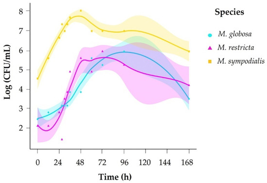 We evaluated growth across 12 sampling times (0–168 h) and counted colony-forming units (CFU) every day for 15 days. Based on growth curves for each species, we set sampling times for volatile organic compound (VOC) profiles accordingly in exponential and stationary growth phases. To determine each species’ exponential and stationary phases, a growth curve was generated in mDixon broth. The species M. sympodialis had a faster growth rate, reaching the exponential phase in 10 h and the stationary phase in 35 h. M. globosa and M. restricta took more time to reach each phase of development (Figure 1, Table 1), with M. globosa exhibiting slower growth.