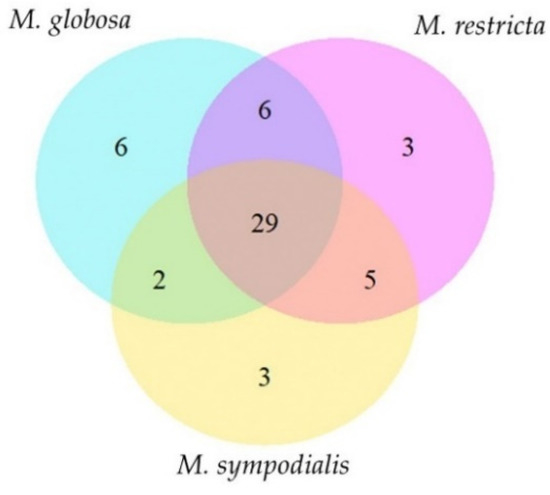 Venn diagram of the volatile profile of Malassezia spp. The diagram indicates unique and shared compounds between Malassezia species. Fifty-four volatile organic compounds were identified for all species.