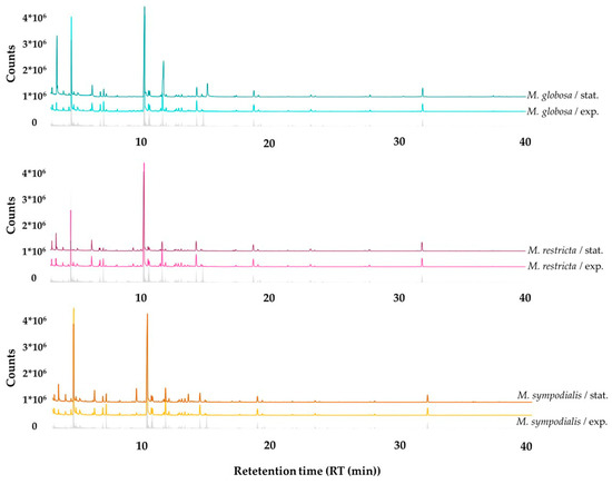 Gas chromatographic profiles of volatile organic compounds (VOCs) detected in the headspace of Malassezia spp. in the exponential and stationary growth phases. The gray line corresponds to the volatile profile of the control, which is mDixon media without yeasts.