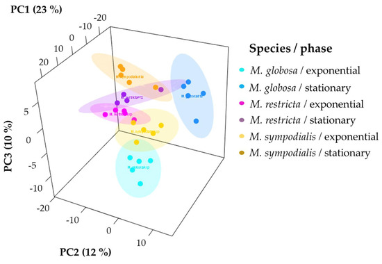 Unsupervised and supervised statistical analyses were performed to determine if the volatile profile allows for the separation of the three species tested. First, the 3D-principal component analysis (PCA) explained 45% of the variance observed in the volatile profiles of Malassezia spp. For each species-growth phase, we plotted ellipses representing confidence intervals of 95% using a normal distribution to facilitate data interpretation. The first PCA dimension explained 23% of the total variance, which allowed for the separation of M. sympodialis in the exponential and stationary phases. Likewise, in this component, the differentiation of M. globosa and M. restricta in the exponential phase is evident (Figure 4). The other two dimensions of PCA explained 12% and 10% of the total variance, where it is possible to differentiate M. globosa and M. restricta in the stationary phase. PCA allowed for the partial discrimination and separation of the Malassezia species according to their volatile profile. In addition, chemical differentiation in the VOCs caused by the growth phase was observed. It was possible to note a high similarity between the three species in the stationary growth phase despite the high variation observed among replicates, especially for M. restricta in the stationary phase with a larger ellipse (Figure 4).
