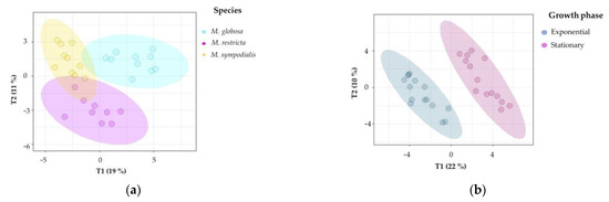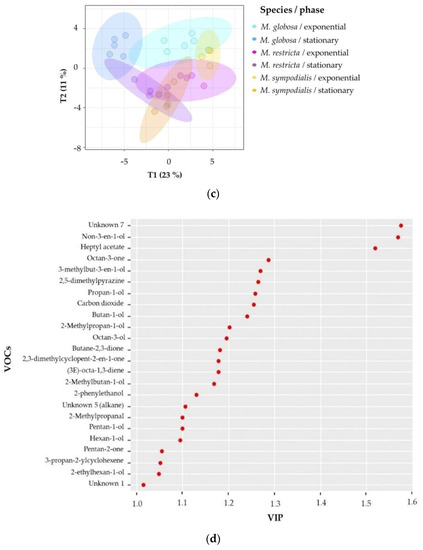 In Figure 5a, discrimination in component 1 explains 19% of the variance and distinguishes M. globosa from the other two species; likewise, component 2 explains 11% of the variance and separates the volatile profile of M. restricta from those of the other two species. In Figure 5b, both phases were perfectly separated in two dimensions, explaining 22% and 10% of the total variance. In addition, the R2Y (0.954) and Q2 (0.877) values indicate that the model is valid, and the prediction accurately explains the importance of the growth phase in the volatile profile. Figure 5c confirms that species and growth phases can differentiate VOCs. The first component summarizes 23% of the variance, while the second explains 11%. In this plot, the first component showed that M. restricta and M. sympodialis were partially separated. In the second component, M. globosa in the exponential and stationary phases was discriminated from the other species.