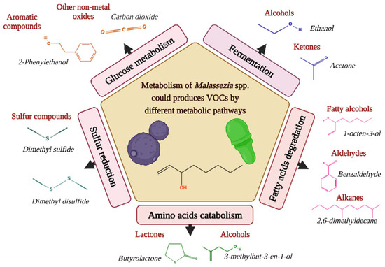 Different metabolic pathways can produce volatile organic compounds (VOCs) in Malassezia species. Representative examples are given per class of volatiles [13].