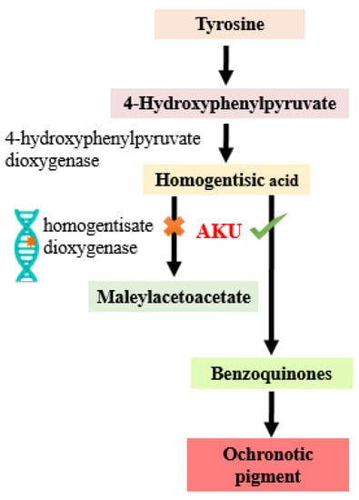 - Introne, W.J.; Perry, M.; Chen, M. Alkaptonuria. 2021. Available online: https://www.ncbi.nlm.nih.gov/books/NBK1454/ (accessed on 15 January 2023).