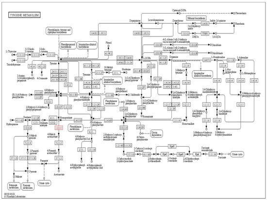 Tyrosine metabolism pathway by KEGG. The highlighted enzyme commission number (EC number) is representing the mutated enzyme in alkaptonuria.