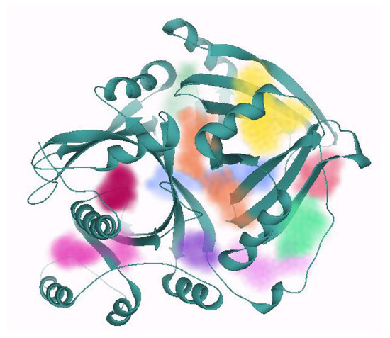A visualization of all the unoccupied binding sites in 4-hydroxyphenylpyruvate dioxygenase. It consists of a total of 10 binding pockets represented by different colors, but the one represented in yellow is selected for having the highest DoGSiteScore. The color of each unoccupied site is numbered and described in Table 1.