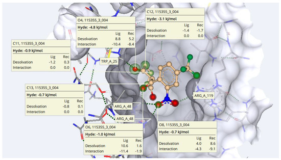Furthermore, the HYDE scoring of each atom in the nitisinone was determined in order to estimate the contribution of the sole atom in the overall millimolar estimated affinity of nitisinone. It can be seen in Figure 5 that oxygen atoms at position number 4, 6, and 8 have HYDE energy of −4.8, −1.0, and −0.7 kJ/mol, respectively. Similarly, the HYDE of carbon atoms at position 11, 12, and 14 are −0.9, −3.1, and −0.7 kJ/mol, respectively. The lower the HYDE scoring, the higher will be the importance of that particular atom in the overall structure [40].