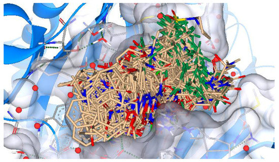 Molecular docking results. The image visualizes all the 540 poses generated from the docking of 54 compounds that were generated by Inspirator mode of SeeSAR based on the nitisinone nucleus.