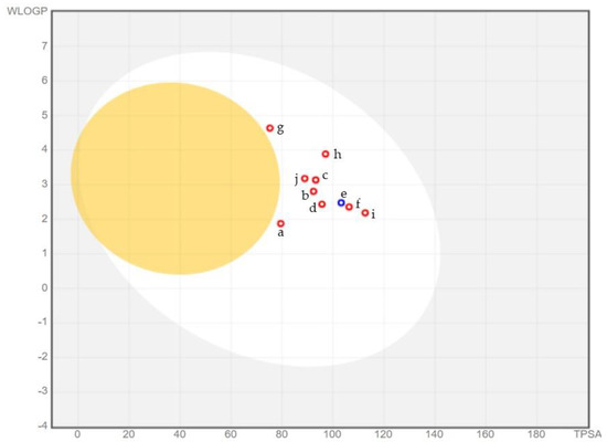 The ADME analysis was performed by SwissADME. According to ADME properties, the selected hits have molecular weight less than 500 g/mol, hydrogen bond acceptors were less than 10, molar refractivity was between 57.75 and 76.07, and topological polar surface area (TPSA) ranged from 75.25 to 112.58 Å. Moreover, the consensus log P values were less than 1.99, whereas log S predicted that all the hits were soluble as elucidated in Table 3. Owing to pharmacokinetic properties, all the hits have high gastrointestinal absorption and were unable to cross the blood–brain barrier (BBB) depicting the safety of central nervous system, as shown in Figure 9 via the boiled egg. This study aims to synthesize drugs that will work outside the central nervous system (CNS) so drugs that will not cross the blood–brain barrier are preferred. The inhibition of cytochrome P450 (CYP) varies, while all obeyed Lipinski, Ghose, Veber, Egan, and Muegge drug-likeness rules with a 0.55 bioavailability score. Furthermore, no PAINS alerts have been observed and synthetic accessibility was from 2.06 to 3.76. All compounds showed lead likeness properties [42]. Compound g, h, and j were excluded because they have shown to inhibit the CYP, thus they can contribute to the toxicity when administered to the patient subsequent to further analysis. Compound g inhibits CYP1A2 and CYP2C19, while compound h inhibits CYP2C19. In addition, CYP1A2 is inhibited by compound j.