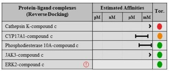The estimated affinities of compound c with the predicted macromolecular targets obtained from molecular docking. The colored circles are depicting the torsion quality of the compound c upon docking with respective macromolecule where green color depicts no torsion, orange color shows bad torsion and red color represents worse torsion.