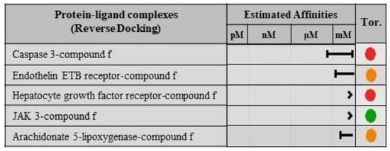 The estimated affinities of compound f with the predicted macromolecular targets obtained from molecular docking. The compound f torsion quality upon docking with respective macromolecule is depicted by colored circles, where green indicates no torsion, orange indicates bad torsion, and red represents worse torsion.