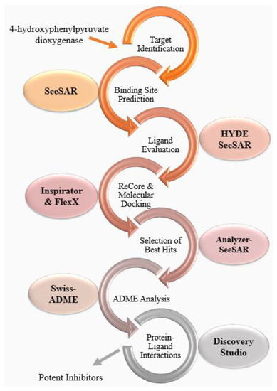 To date, alkaptonuria is without a specific cure; however, it is being managed via physiotherapy, painkillers, and surgery for replacing joints [34]. Additionally, several studies have reported the use of nitisinone, which is a US Food and Drug Administration (FDA)-approved drug for tyrosinemia type 1, to ameliorate AKU by arresting ochronosis [35]. However, the FDA has not approved its use for alkaptonuria treatment because the use of nitisinone has caused acquired tyrosinosis, elevated liver transaminases, and corneal crystals [1,27,36]. Therefore, alkaptonuria specific drug is required with minimal side effects to treat the patients. Therefore, in the current study, computational approaches were used to identify potent and druggable inhibitors of alkaptonuria through targeting 4-hydroxyphenyl pyruvate dioxygenase. This enzyme is an alpha-keto acid dependent oxygenases and catalyzes the oxidative decarboxylation of 4-hydroxyphenyl pyruvate (HPP) to form homogentisic acid (HGA) [37]. The acquired results showed promising compounds that could further be validated through experimental work and serve as a potential treatment for the very rare inherited disorder, alkaptonuria.