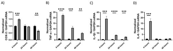 The effect of LPS on mRNA expression in brain tissue at 4, 24, and 48 h. Changes in mRNA expression as measured by RT-qPCR for: (A) COX-2, (B) TNF-α, (C) IL-1β, (D) IL-6. Glyceraldehyde-3-phosphate dehydrogenase (GAPDH) was used as a loading control. Data were analyzed with (A–D): Multiple t-tests were performed with a false discovery rate correction (Q = 5%, n = 3–6). Significance (p) is indicated within the figures using the following scale: **, p < 0.01; ***, p < 0.001; ****, p < 0.0001. Bars represent mean ± SEM.
