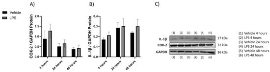 The effect of LPS and vehicle treatments on expression of COX-2 and IL-1β in 4, 24, and 48 h time points. Figures represent changed protein expression for selected genes measured by Western blot. Glyceraldehyde-3-phosphate dehydrogenase (GAPDH) was used as a loading control. Relative densitometry is presented as a ratio to GAPDH. (A) COX-2 expression, (B) IL-1β expression, (C) representative images blots with each protein detected. Original membranes can be seen in Figures S3–S5. Multiple t-tests were performed with a false discovery rate correction (Q = 5%, n = 3). The samples for each protein were run on the same gel. No image enhancements were applied.