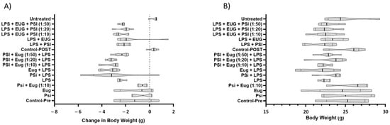 There were no statistically significant differences in body weight at collection; however, statistically significant differences were noted in the change in body weight (Figure 3, Table S3). In the psilocybin + LPS pre-treatment group, mice gained up to 0.8 and lost up to 5.9 g of body weight. Notably, mice pre-treated with eugenol + LPS and mice pre-treated with psilocybin + eugenol (1:10) + LPS showed a similar decrease in weight between 2.5 to 4 g. LPS + eugenol showed better results for the post-treatment compared to the pre-treatment condition. Not only did this result in less severe loss, which was between 1.5 to 2.4 g, but some of the mice in the group gained between 0.8 and 1.7 g of weight.