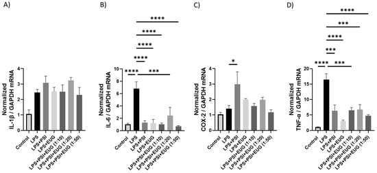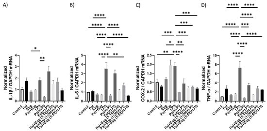 While LPS treatment resulted in IL-1β levels that trended higher than the control (p = N.S.), no differences were seen in any post-treatment compared to the LPS group (p = N.S., Figure 5A). In contrast, relative IL-6 mRNA levels were significantly upregulated in the LPS group compared to the control (p < 0.0001), and all post-treatment groups significantly downregulated IL-6 mRNA levels compared to LPS group (p < 0.0001, Figure 5B). Surprisingly, LPS did not upregulate COX-2 mRNA levels (p = N.S.), while LPS + Psi upregulated COX-2 levels compared to the LPS group (p < 0.05, Figure 5C). Similarly, TNF-α was significantly upregulated in the LPS group compared to the control (p < 0.001), while all post-treatments significantly downregulated TNF-α levels compared to the LPS group (p < 0.001, Figure 5D).