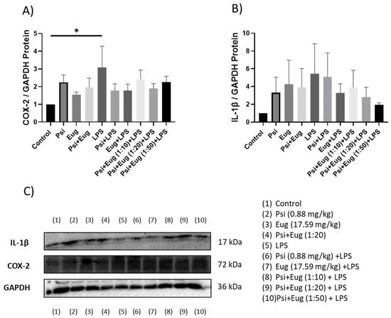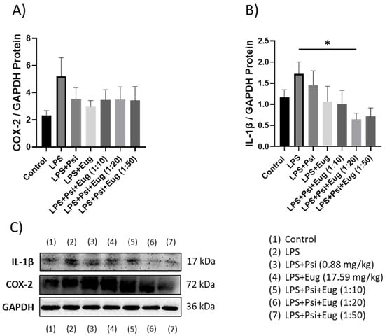 The effect of combined treatment of eugenol + psilocybin varied not only in pre- and post-treatment but depended on different ratios of these two drugs. Pre-treated mice with psilocybin + eugenol in a ratio of 1:50 demonstrated the best results compared to all other groups with no significant decrease of IL-1β (Figure 4A). The Western blots, however, showed a slight decrease in COX-2 and IL-1β (p = N.S., Figure 6A,B). Besides that, LPS + psilocybin + eugenol (1:50) demonstrated a significant decrease in IL-6 expression (Figure 8E) but not IL-1β. This may be due to eugenol’s influence, as similar results were described for eugenol in one of the studies [].