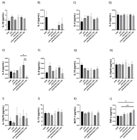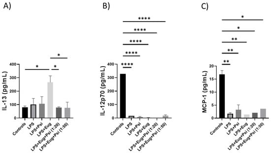 Next, we measured pro-inflammatory cytokines collected in blood using the ELISA. As shown in Figure 9A, LPS + eugenol has a significantly higher expression of IL-13 compared to the control and LPS + Eug + Psi (1:20 and 1:50) groups (p < 0.05). On the other hand, the control group has significantly higher expression of IL-12p70 (p < 0.0001) and monocyte chemotactic protein-1 (MCP-1, p < 0.05) compared to all other groups (Figure 9B,C, respectively). Additional ELISA data can be found in the Supplementary Materials (Figures S12 and S13).