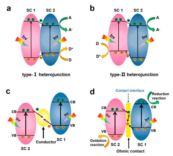 The third-generation direct Z-type heterojunction is composed of only a reduced semiconductor and an oxidized semiconductor with a matching band structure and an ohmic contact at the interface (Figure 3d). This ohmic contact interface has certain defects and can be used as a recombination center for the electrons on the CB of the oxidized semiconductor and the holes on the VB of the reduced semiconductor. In addition, the impurity orbits contribute quasi-continuous energy levels and become charge transfer mediators. In addition to inheriting the advantages of the first two generations of Z-scheme systems, the direct Z-scheme without a solid medium greatly reduces the construction cost. Meanwhile, the direct Z-type heterostructure overcomes the light-shielding effect caused by redox pairs or noble metal particles []. Although the resistance of the direct Z-scheme at the solid–solid interface is generally considered to be higher than that of the all-solid-state Z-scheme, it is often possible to improve the conductivity of the interface by regulating or optimizing the chemical-binding force through molecular polarization to maximize the advantages of the Z-scheme heterojunction [].