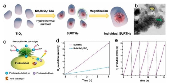 The morphology and structure of cocatalysts are important factors that can influence the photocatalytic performance. Cocatalysts typically exhibit morphologies such as nanoparticles, nanospheres, flakes, clusters, nanotubes, and quantum dots. Inspired by nature, Lin et al. designed novel sea-urchin-like ReS2 nanosheet/TiO2 nanoparticle heterojunctions through a simple one-pot hydrothermal method (Figure 4). Compared with the bulk ReS2 cocatalyst composed of a large number of agglomerated nanoparticles or nanosheets, the sea-urchin-like ReS2 cocatalyst shows a significantly accelerated charge transfer due to the unusual charge edge-collection effect. The photocatalytic H2 evolution rate is 3.71 mmol h−1 g−1 (an apparent quantum efficiency (AQE) of 16.09%), which is 231.9 times that of P25 TiO2 [].