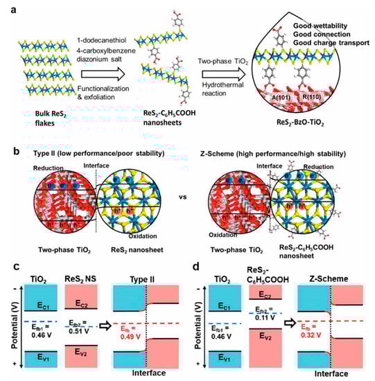 (a) Preparation for multiple junctions between functionalized ReS2 nanosheets and two-phase TiO2. (b) Proposed transfer paths of photogenerated charges in terms of contact properties at the interface. Type II: The energy bands of TiO2 and nonfunctionalized ReS2 nanosheet can bend upward and downward toward the physically contacted interface, respectively. Z-scheme: The energy bands of TiO2 and ReS2−C6H5COOH can bend downward and upward toward the chemically contacted interface, respectively. (c,d) Proposed energy band diagrams for ReS2 NS/TiO2 (type II) and ReS2−BzO−TiO2 (Z-scheme) based on the flat-band potentials of each component (EC—conduction band energy; EV—valence band energy; Efb—flat-band energy) []. Reproduced with permission: Copyright 2020, American Chemical Society.