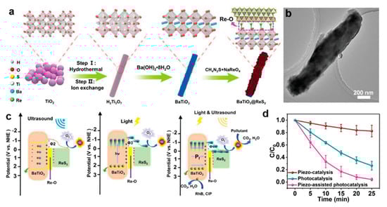 - Liu, W.; Wang, P.; Ao, Y.; Chen, J.; Gao, X.; Jia, B.; Ma, T. Directing Charge Transfer in a Chemical-Bonded BaTiO3 @ReS2 Schottky Heterojunction for Piezoelectric Enhanced Photocatalysis. Adv. Mater. 2022, 34, e2202508. [Google Scholar] [CrossRef]