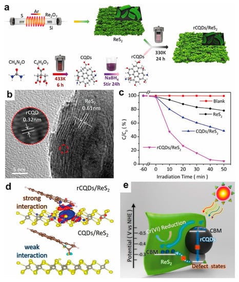 Heavy metals in aquatic systems and drinking water sources are acutely toxic and carcinogenic to most organisms. Taking Cr (VI) as an example, photocatalytic reduction of Cr (VI) to low-toxic Cr (III) is generally considered to be a promising and practical option because this method is more effective and low-cost and does not produce any hazardous chemicals. Zhou et al. proposed a simple and feasible atomic hybridization strategy to accelerate the reaction kinetics process via constructing electronic pathways []. The reduced carbon quantum dots (rCQDs)/ReS2 heterostructure is synthesized via the CVD and hydrothermal method (Figure 8a,b). Compared with pure ReS2 nanosheets and CQDs/ReS2, the reduction reaction rate constants of the pseudo-first-order kinetic model were increased by about 13.1 and 4.3 times, respectively. (Figure 8c). C=O double bonds reduced and then anchored onto ReS2 nanosheets can form an electronic channel via Re-5d and O-2p orbital hybridization (Figure 8d), in which a photoinduced carrier of the rCQDs can freely migrate to ReS2 for hexavalent chromium reduction (Figure 8e) [].