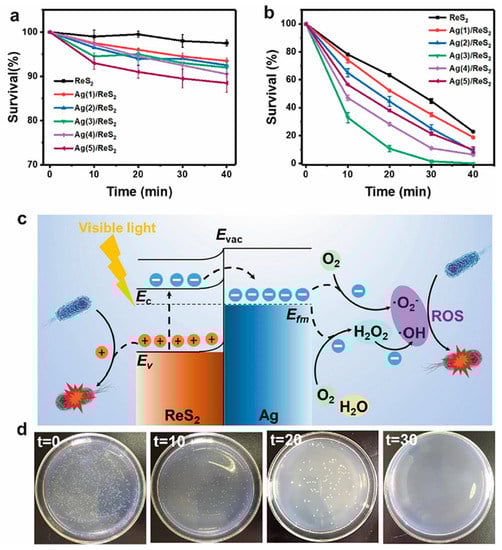 The treatment cost of freshwater pollution is high, and the shortage of freshwater resources has become a more complex problem. Photocatalysis techniques have been regarded as one of the most promising strategies for environmental remediation. It is well known that when the photocatalyst absorbs light, electron−hole pairs are formed, which interact with water and dissolved oxygen to generate activated oxygen species (ROS), such as hydroxyl radicals, singlet oxygen, and superoxide []. These strong oxidants can destroy essential macromolecules in bacteria, resulting in bacterial disinfection []. The field of ReS2 photocatalytic sterilization is still in the preliminary stages. Pioneer work by Ghoshal et al. proved that vertically oriented ReS2 nanosheets show great potential for photocatalytic water disinfection []. However, due to the rapid recombination of the carriers, its inactivation efficiency still needs to be further enhanced.