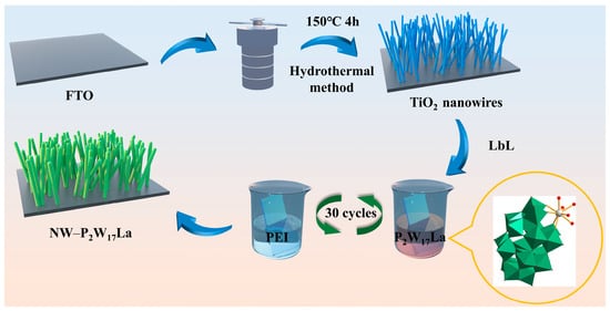 The TiO2 nanowire substrate was synthesized via a hydrothermal synthesis technique according to our previously reported procedure [33]. The multiple-layer film was assembled via the LbL self-assembly method. FTO glass coated with the nanowire substrate was soaked in APS for 12 h, soaked in HCl (pH = 2.0) for 20 min, rinsed with distilled water to remove any HCl attached to the surface, and dried under a nitrogen stream. The nanowire-modified FTO glass was soaked in an aqueous P2W17La solution (5 × 10−3 mol L−1) for 7 min, washed with distilled water, and dried under a nitrogen stream. The FTO glass was then immersed in PEI (5 × 10−3 mol L−1, pH = 4) for 7 min. The POMs and PEI have opposite charges and are alternately deposited on the substrate via electrostatic attraction. This procedure was repeated 30 times to obtain the NW–P2W17La film comprising 30 layers of P2W17La. For comparison, a pure P2W17La film (denoted as FTO–P2W17La), which comprised 30 layers of P2W17La, was fabricated on unmodified FTO glass using the same method.