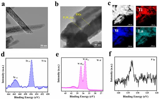 TEM images of (a) TiO2 NW and (b) NW–P2W17La. (c) EDS elemental mapping patterns of Ti, W, and La in the NW–P2W17La films. (d–f) Ti, W, and P XPS spectra of the NW–P2W17La composite film.