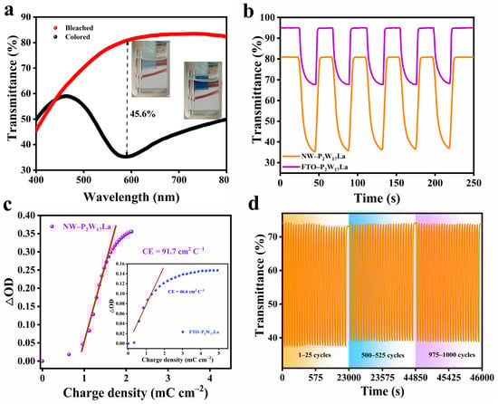 The EC characteristics of the NW–P2W17La film were examined using an electrochemical workstation in conjunction with a UV/Vis spectrometer, and contrasted with those of the FTO–P2W17La film. Figure 4a shows the visible transmittance spectra (400−800 nm) of the NW–P2W17La composite film in the bleached and colored states at 0 V and −1.3 V, respectively. Digital photographs of the electrodes show that, when the applied potential is 0 V, the NW–P2W17La film appears transparent. After applying the −1.3 V negative potential, the film exhibits a deep blue color owing to the reduction of P2W17La and TiO2 (insets, Figure 4a). The maximum optical contrast occurs at 591 nm. The redox reactions and color change of P2W17La and TiO2 are summarized in Equations (1) and (2), respectively [38,39]: