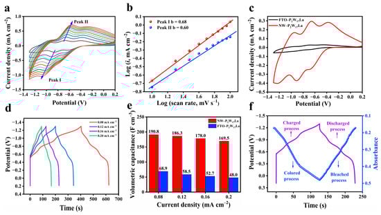 The electrochemical properties of as-prepared films were measured using cyclic voltammetry (CV) and galvanostatic charge/discharge (GCD) tests. The three pairs of redox peaks on the NW–P2W17La film CV curve are attributed to the redox reaction between WVI and WV and represent typical faradaic behavior during ion insertion/extraction (Figure 5a) [41]. When the scan rate is increased from 10 to 100 mV s−1, the shapes of the curves remain largely unchanged, except that the peak potential exhibits a minor shift. The anodic peaks shift toward positive potentials and cathodic peaks shift toward negative potentials, which can be attributed to a reversible but nonideal redox process [42]. To reveal the electrochemical kinetic process, the relationship between the oxidation/reduction peak current and the scan rate was studied. The peak current density i and the corresponding scan rate follow the mathematical relationship i = ab, where a is an adjustable parameter and b is the slope of the linear log i versus log curve. The magnitude of the slope can be used to characterize the ion storage mechanism during charging and discharging [43]. When b = 0.5, the electrochemical reaction process is governed by the diffusion-controlled process, whereas b = 1 indicates that the process is primarily controlled by the surface reaction, resulting in a capacitance-controlled process. The linear relationship between log i and log is shown in Figure 5b and the b-values of peaks I and II are 0.68 and 0.60, respectively. This shows that the kinetic process taking place in the NW–P2W17La film is controlled by ion diffusion and capacitive effects.