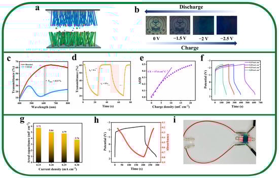 Amidst increasing environmental pollution and the gradual exhaustion of non-renewable energy resources, the development of controllable devices for energy storage, conversion, and protection, such as smart windows [1,2,3], micro-supercapacitors [4,5], lithium-ion batteries [6,7], electrochemical capacitors [8,9], and solar cells [10,11], has become a global priority. Electrochromic (EC) devices and batteries/pseudocapacitors have similar electrode materials, device structures, and faradaic reactions [12]. Integrating electrochromic and energy storage properties into a single platform to construct electrochromic energy storage devices (EESDs) enables versatile use of energy and significantly reduces the cost of energy storage [13,14,15,16]. EESDs change color in real time based on the level of stored energy and have the potential to be used in new smart electronic products [17], smart clothing [18], and military equipment [19].