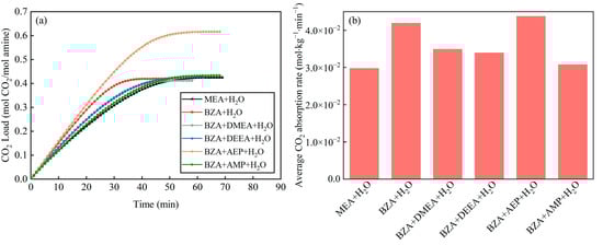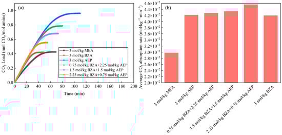 Absorption characteristics of mixed aqueous amines (a) the change in the CO2 load of the mixed aqueous amines and (b) the average CO2 absorption rate of the mixed aqueous amines.