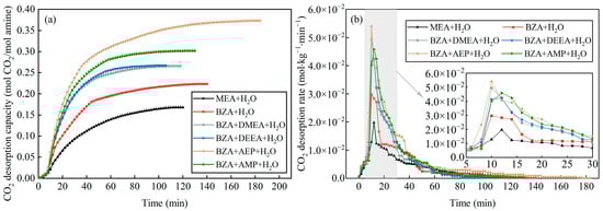 Desorption characteristics of BZA-AEP. (a) the effects of the BZA-AEP concentration ratio on CO2 desorption capacity and (b) the effects of the BZA-AEP concentration ratio on CO2 desorption rate.