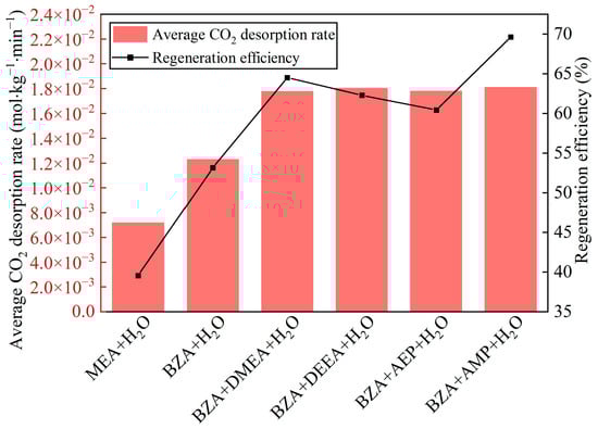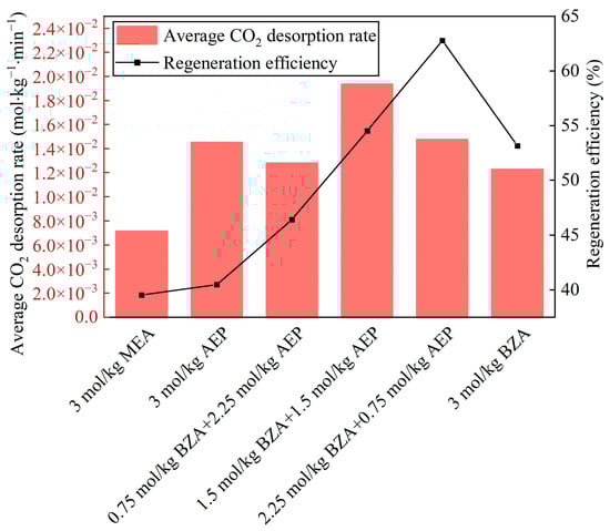 The BZA-AEP concentration ratio affects CO2 desorption capacity and rate. Figure 5a illustrates the variation in the CO2 desorption capacity of BZA-AEP with time. The desorption equilibrium time increases as the proportion of AEP concentration increases. Although AEP has a high CO2 load, most of it cannot be desorbed, and mixing it with BZA enhances its regeneration efficiency. The CO2 desorption capacity of BZA-AEP is increased by 33~131% relative to MEA. Moreover, the thermal degradation of AEP is relatively high. In Figure 5b, it is shown that the time to reach the maximum CO2 desorption rate decreases with increasing BZA concentration. The maximum CO2 desorption rate of BZA-AEP increased by 51% to 182% relative to MEA. It can be seen from Figure 6 that the average CO2 desorption rate of BZA-AEP was increased by 70~170% compared to MEA, which had the highest value at a BZA to AEP concentration ratio of about one. The average CO2 desorption rate of 3M MEA-1.5M MDEA-1.5M PZ mixed aqueous amines studied by Zhang et al. [39] was 119% faster than that of 5M MEA. When the concentration ratio of BZA to AEP was one, the average CO2 desorption rate of BZA-AEP was more enhanced than that of traditional absorbent MEA relative to 3M MEA-1.5M MDEA-1.5M PZ. The highest regeneration efficiency is 63%, which has the largest value at a BZA to AEP concentration ratio of about three.