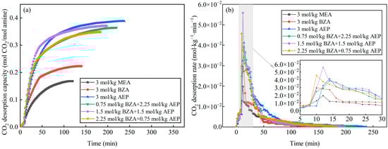 Desorption characteristics of mixed aqueous amines. (a) the variation of mixed aqueous amine CO2 desorption capacity and (b) the variation of mixed aqueous amine average CO2 desorption rate.