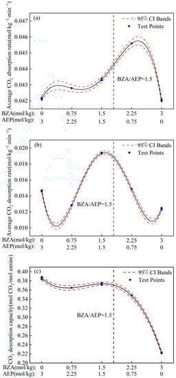 Fitted model of BZA-AEP absorption and desorption performance. (a) the average CO2 absorption rate, (b) the average CO2 desorption rate and (c) the CO2 desorption capacity.