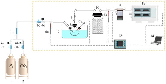Flow chart of the experimental setup (1. N2 cylinder, 2. CO2 cylinder, 3. flow control valve (3a,3b,3c), 4. gas flow meter (4a,4b,4c), 5. gas mixer, 6. temperature sensor (6a,6b,6c), 7. oil bath, 8. three-neck flask, 9. condenser tube, 10. drying bottle, 11. mass flow meter, 12. flue gas analyzer, 13. data acquisition instrument, 14. computer).