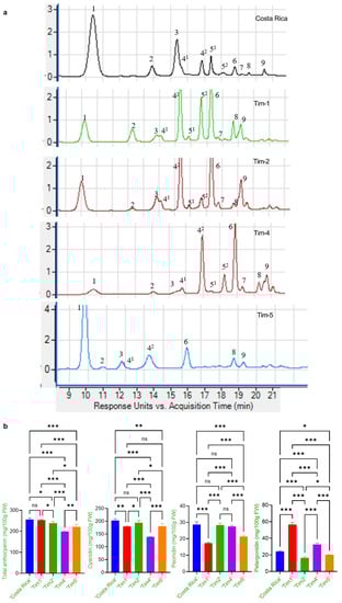(a) Anthocyanin chromatograms of the ‘Costa Rica’ parent and developed ‘Tim’ F6 sweetcorn lines at 25 DAP obtained from UHPLC-DAD-MS at 520nm, with peaks (1) cyanidin-3-glucoside, (2) pelargonidin-3-glucoside, (3) peonidin-3-glucoside, (41) cyanidin-3-malonyl glucoside, (42) cyanidin-3-malonyl glucoside isomer, (51) pelargonid-in-3-malonyl glucoside, (52) pelargonidin-3-malonyl glucoside isomer, (6) cyanidin-3-dimalonyl glucoside, (7) peonidin-3-malonyl glucoside, (8) pelargonidin-3-dimalonyl glucoside, (9) peonidin-3-dimalonyl glucoside; (b) Fresh weight concentration of total anthocyanin and cyanidin-, peonidin- and pelargonidin-based anthocyanins of ‘Costa Rica’ and the ‘Tim’ F6 sweetcorn lines at 25 DAP. ns = non-significant, * = significant at p < 0.05, ** = significant at p < 0.01, and *** = significant at p < 0.001).